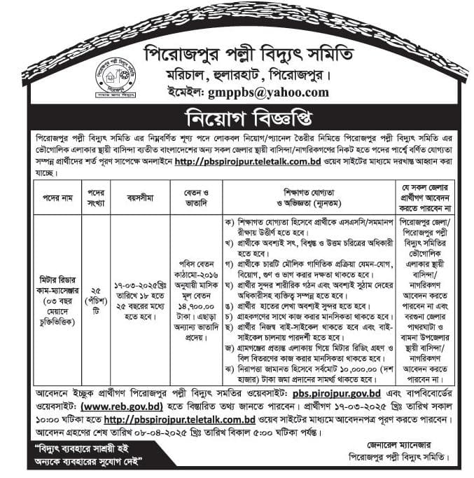 | মিটার রিডার কাম-ম্যাসেঞ্জার (০৩ বছর মেয়াদে চুক্তিভিত্তিক) | ২৫ (পঁচিশ) টি | ১৭-০৩-২০২৫ খ্রিঃ তারিখে ১৮ হতে ২৫ বছরের মধ্যে হতে হবে। | পবিস বেতন কাঠামো-২০১৬ অনুযায়ী মাসিক মূল বেতন ১৪,৭০০ টাকা। অন্যান্য ভাতাদি প্রদান করা হবে। | ক) শিক্ষাগত যোগ্যতা হিসেবে প্রার্থীকে এসএসসি/সমমান পরীক্ষায় উত্তীর্ণ হতে হবে।খ) প্রার্থীকে অবশ্যই সৎ, বিশ্বস্ত ও উত্তম চরিত্রের অধিকারী হতে হবে।গ) প্রার্থীকে চারটি মৌলিক গাণিতিক প্রক্রিয়া (যোগ, বিয়োগ, গুণ, ভাগ) করার দক্ষতা থাকতে হবে।ঘ) প্রার্থীর সুন্দর শারীরিক গঠন এবং সুঠাম দেহের অধিকারী হতে হবে।ঙ) প্রার্থীর হাতের লেখা অবশ্যই সুন্দর হতে হবে।চ) গ্রাহকগণের সাথে কাজ করার মানসিকতা থাকতে হবে।ছ) প্রার্থীর নিজস্ব বাই-সাইকেল থাকতে হবে এবং বাই-সাইকেল চালনায় পারদর্শী হতে হবে।জ) গ্রামগঞ্জের প্রত্যন্ত এলাকায় গিয়ে মিটার রিডিং গ্রহণ ও বিল বিতরণের কাজ করার মানসিকতা থাকতে হবে। | পিরোজপুর জেলা/পিরোজপুর পল্লী বিদ্যুৎ সমিতির ভৌগোলিক এলাকার স্থায়ী বাসিন্দা/নাগরিকগণ আবেদন করতে পারবেন না।বরগুনা জেলার পাথরঘাটা ও বামনা উপজেলার স্থায়ী বাসিন্দা/নাগরিকগণ আবেদন করতে পারবেন না। |