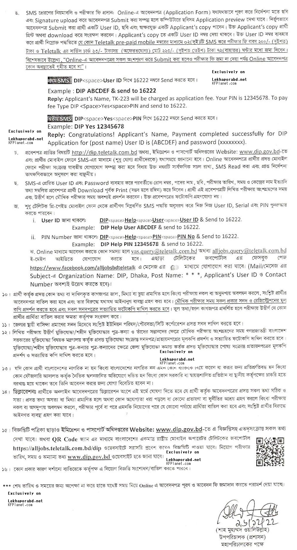 All Applicants can pay the DIP job application fee by sending only 2 SMS from any Teletalk prepaid SIM