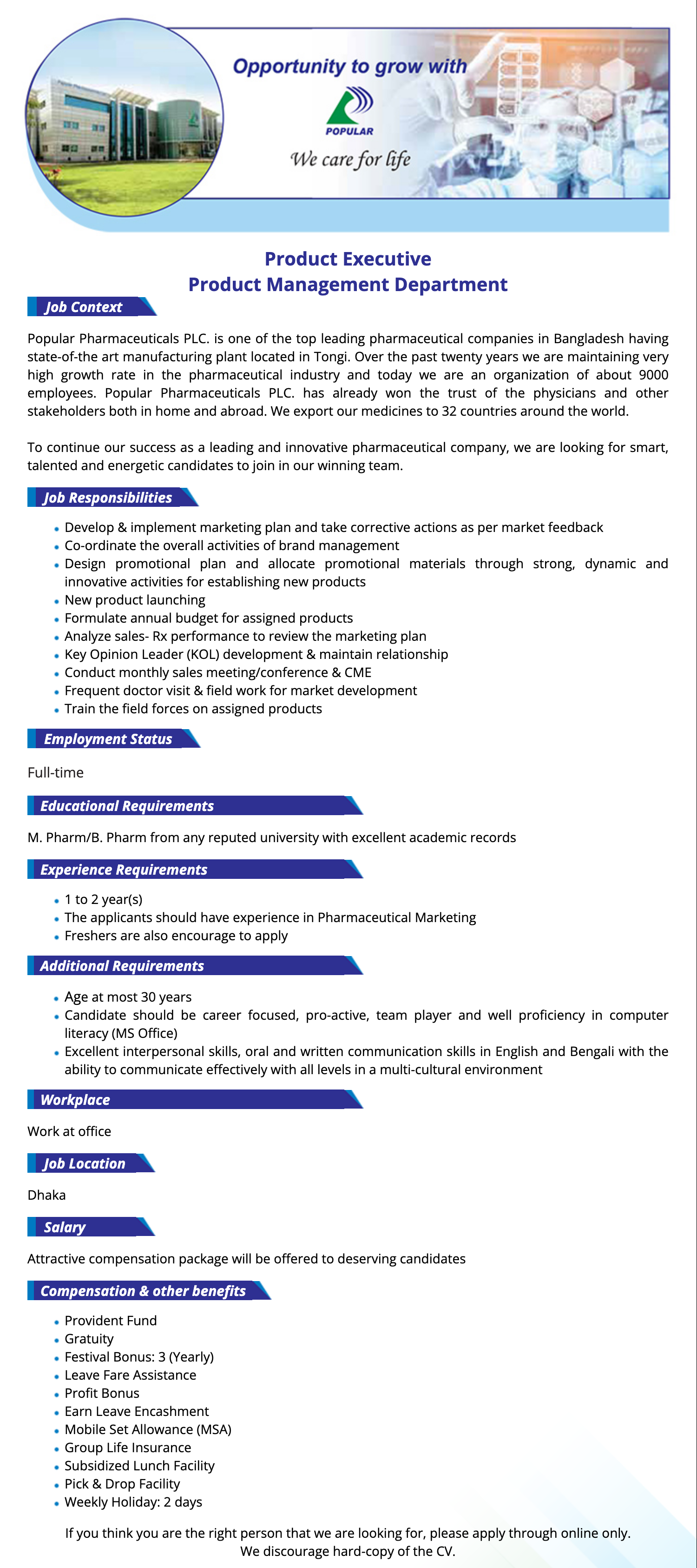 Every company for their need has announced a Job Notice as per company requirements. Now in the section, we have shared Popular Pharmaceuticals Ltd. of company Job Notice with all the details in the table. Please check the job circular requirements of private company jobs here you will get s Popular Pharmaceuticals Ltd. Job updates and Apply Job Notice all data which helps to know how to submit your job application and to get the best private company BD job news.